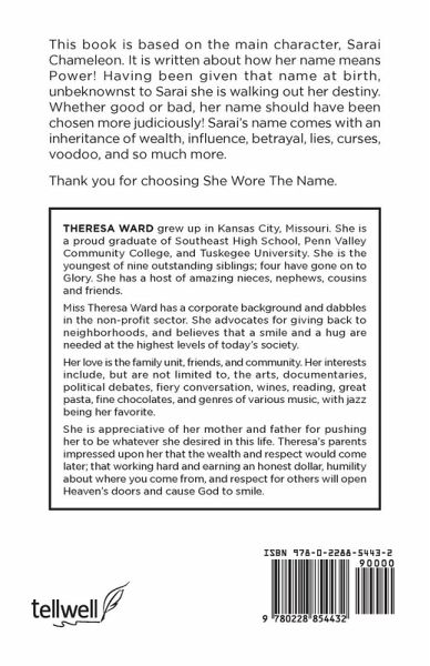 This book is based on the main character, Sarai Chameleon. It is written about how her name means Power! Having been given that name at birth, unbeknownst to Sarai she is walking out her destiny. Whether good or bad, her name should have been chosen more judiciously! Sarai's name comes with an inheritance of wealth, influence, betrayal, lies, curses, voodoo, and so much more. Thank you for choosing She Wore The Name.