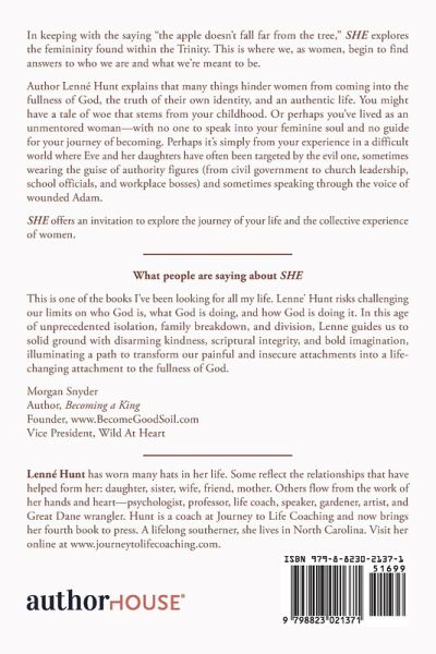 In keeping with the saying "the apple doesn't fall far from the tree," She explores the femininity found within the Trinity. This is where we, as women, begin to find answers to who we are and what we're meant to be. Author Lenné Hunt explains that many things hinder women from coming into the fullness of God, the truth of their own identity, and an authentic life. You might have a tale of woe that stems from your childhood. Or perhaps you've lived as an unmentored woman-with no one to speak into your feminine soul and no guide for your journey of becoming. Perhaps it's simply from your experience in a difficult world where Eve and her daughters have often been targeted by the evil one, sometimes wearing the guise of authority figures (from civil government to church leadership, school officials, and workplace bosses) and sometimes speaking through the voice of wounded Adam. She offers an invitation to explore the journey of your life and the collective experience of women.