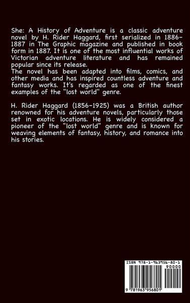 She: A History of Adventure is a classic adventure novel by H. Rider Haggard, first serialized in 1886-1887 in The Graphic magazine and published in book form in 1887. It is one of the most influential works of Victorian adventure literature and has remained popular since its release. The novel has been adapted into films, comics, and other media and has inspired countless adventure and fantasy works. It's regarded as one of the finest examples of the "lost world" genre. H. Rider Haggard (1856-1925) was a British author renowned for his adventure novels, particularly those set in exotic locations. He is widely considered a pioneer of the "lost world" genre and is known for weaving elements of fantasy, history, and romance into his stories.