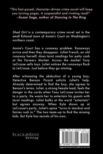 "This fast-paced, character-driven crime novel will keep you turning pages. A suspenseful and riveting read!" -Susan Sage, author of Dancing In The Ring Shed Girl is a contemporary crime novel set in the small fictional town of Annie's Court on Washington's northern coast. Annie's Court has a runaway problem. Runaways arrive and then they disappear. Juliet French, an old runaway herself, does tarot readings for petty cash at the Farmers Market. Across the market Tony LeCrosse sells toys. Juliet notices the runaways flock to LeCrosse. Just before they go missing. After witnessing the abduction of a young boy, Detective Benson Picard solicits Juliet's help. Already determined to find the boy, she agrees to Benson's terms. Juliet, a strong female lead, feels the danger in the cards when Tony LeCrosse invites her to a party. He wants her to entertain his guests with tarot readings. Juliet balks at the word "entertain" but agrees anyway. When Kyle shows up at LeCrosse's party, Juliet's spine "turns to stardust and fairies rush in." The two team-up to find the missing kids. But Kyle has secrets of his own.