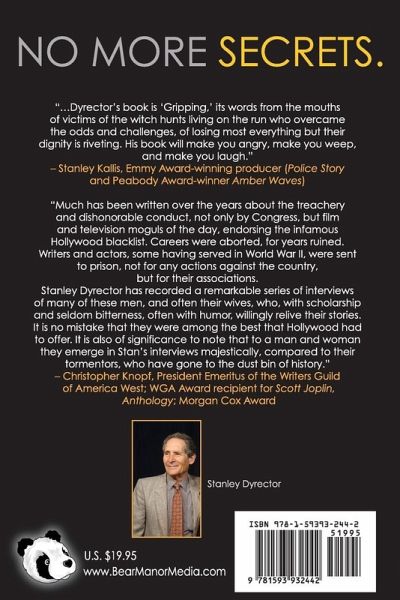 What Really Happened There were terrible crimes committed against greatly talented American citizens by overzealous and unconscionable government actions. Meet the victims inside this book. See for yourself what happened to the innocent, what they went through, how they coped with their persecution, and how they survived the aftermath with their chins up, in dignity. "Congratulations Stanley Dyrector...WAVE AWARDS... Video Excellence Award presented for Community Media in Santa Fe, New Mexico on November 9, 2001, The Stanley Dyrector Show: The Hollywood Blacklist..." "Dyrector has encountered countless people that help Hollywood sparkle but never get a chance to shine...Screenwriters on the Hollywood Blacklist in the 50's denied work due to their politics..." - Debra Beyer, Los Angeles Times, May 9, 2006. "...I'm not afraid to be corrected by a guest, or to tell them I love them!"...Dyrector explored the blacklisting period of Hollywood during the McCarthy era..." California Seniors Weekly (2000) About the Author Stanley Dyrector was born in Brooklyn, New York. Beginning his career as an actor, he switched to writing, where he found much success. His TV writing credits include such popular shows as Wagon Train and Slattery's People. He and his wife, Joyce, teamed up and wrote for daytime TV soaps on ABC, as well as hour radio dramas and comedies for Sears Radio Theatre and Mutual Radio Theatre. Dyrector's 2-act Vietnam-era play, A Pelican of the Wilderness, was deemed by LA Times critic John Mahoney as "Outstanding." His award-winning interview show called The Stanley Dyrector Show can be seen in various locales and on the Internet.