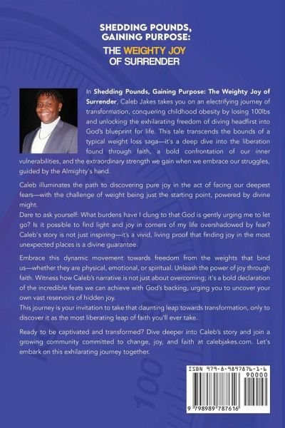 In Shedding Pounds, Gaining Purpose: The Weighty Joy of Surrender, Caleb Jakes takes you on an electrifying journey of transformation, conquering childhood obesity by losing 100lbs, and unlocking the exhilarating freedom of diving headfirst into God's blueprint for life. This tale transcends the bounds of a typical weight loss saga-it's a deep dive into the liberation found through faith, a bold confrontation of our inner vulnerabilities, and the extraordinary strength we gain when we embrace our struggles, guided by the Almighty's hand. Caleb illuminates the path to discovering pure joy in the act of facing our deepest fears-with the challenge of weight being just the starting point, powered by divine might. Dare to ask yourself: What burdens have I clung to that God is gently urging me to let go? Is it possible to find light and joy in corners of my life overshadowed by fear? Caleb's story is not just inspiring -it's a vivid, living proof that finding joy in the most unexpected places is a divine guarantee. Embrace this dynamic movement towards freedom from the weights that bind us-whether they are physical, emotional, or spiritual. Unleash the power of joy through faith. Witness how Caleb's narrative is not iust about overcoming: it's a bold declaration of the incredible feats we can achieve with God's backing, urging you to uncover your own vast reservoirs of hidden jov. This journey is your invitation to take that daunting leap towards transformation, only to discover it as the most liberating leap of faith you'll ever take. Ready to be captivated and transformed? Dive deeper into Caleb's story and join a growing community committed to change, joy, and faith at calebjakes.com. Let's embark on this exhilarating journey together.