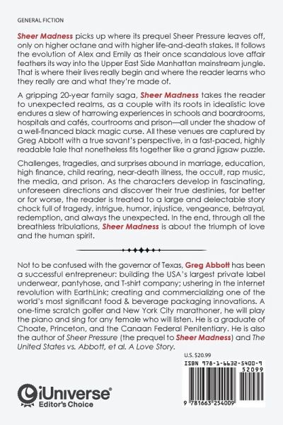 Sheer Madness picks up where its prequel Sheer Pressure leaves off, only on higher octane and with higher life-and-death stakes. It follows the evolution of Alex and Emily as their once scandalous love affair feathers its way into the Upper East Side Manhattan mainstream jungle. That is where their lives really begin and where the reader learns who they really are and what they're made of. A gripping 20-year family saga, Sheer Madness takes the reader to unexpected realms, as a couple with its roots in idealistic love endures a slew of harrowing experiences in schools and boardrooms, hospitals and cafés, courtrooms and prison-all under the shadow of a well-financed black magic curse. All these venues are captured by Greg Abbott with a true savant's perspective, in a fast-paced, highly readable tale that nonetheless fits together like a grand jigsaw puzzle. Challenges, tragedies, and surprises abound in marriage, education, high finance, child rearing, near-death illness, the occult, rap music, the media, and prison. As the characters develop in fascinating, unforeseen directions and discover their true destinies, for better or for worse, the reader is treated to a large and delectable story chock full of tragedy, intrigue, humor, injustice, vengeance, betrayal, redemption, and always the unexpected. In the end, through all the breathless tribulations, Sheer Madness is about the triumph of love and the human spirit.