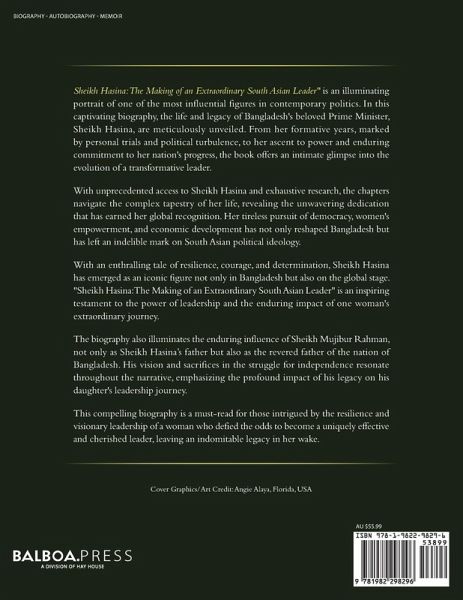 Sheikh Hasina: The Making of an Extraordinary South Asian Leader" is an illuminating portrait of one of the most influential figures in contemporary politics. In this captivating biography, the life and legacy of Bangladesh's beloved Prime Minister, Sheikh Hasina, are meticulously unveiled. From her formative years, marked by personal trials and political turbulence, to her ascent to power and enduring commitment to her nation's progress, the book offers an intimate glimpse into the evolution of a transformative leader. With unprecedented access to Sheikh Hasina and exhaustive research, the chapters navigate the complex tapestry of her life, revealing the unwavering dedication that has earned her global recognition. Her tireless pursuit of democracy, women's empowerment, and economic development has not only reshaped Bangladesh but has left an indelible mark on South Asian political ideology. With an enthralling tale of resilience, courage, and determination, Sheikh Hasina has emerged as an iconic figure not only in Bangladesh but also on the global stage. "Sheikh Hasina: The Making of an Extraordinary South Asian Leader" is an inspiring testament to the power of leadership and the enduring impact of one woman's extraordinary journey. The biography also illuminates the enduring influence of Sheikh Mujibur Rahman, not only as Sheikh Hasina's father but also as the revered father of the nation of Bangladesh. His vision and sacrifices in the struggle for independence resonate throughout the narrative, emphasizing the profound impact of his legacy on his daughter's leadership journey. This compelling biography is a must-read for those intrigued by the resilience and visionary leadership of a woman who defied the odds to become a uniquely effective and cherished leader, leaving an indomitable legacy in her wake.