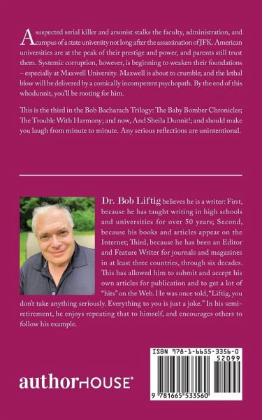 A suspected serial killer and arsonist stalks the faculty, administration, and campus of a state university not long after the assassination of JFK. American universities are at the peak of their prestige and power, and parents still trust them. Systemic corruption, however, is beginning to weaken their foundations - especially at Maxwell University. Maxwell is about to crumble; and the lethal blow will be delivered by a comically incompetent psychopath. By the end of this whodunnit, you'll be rooting for him. This is the third in the Bob Bacharach Trilogy: The Baby Bomber Chronicles; The Trouble With Harmony; and now, And Sheila Dunnit!; and should make you laugh from minute to minute. Any serious reflections are unintentional.