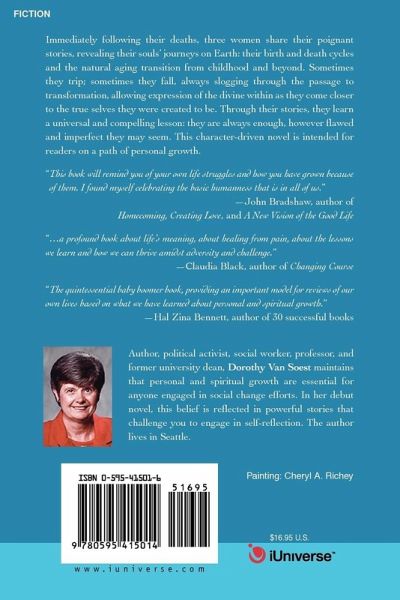 Immediately following their deaths, three women share their poignant stories, revealing their souls' journeys on Earth: their birth and death cycles and the natural aging transition from childhood and beyond. Sometimes they trip; sometimes they fall, always slogging through the passage to transformation, allowing expression of the divine within as they come closer to the true selves they were created to be. Through their stories, they learn a universal and compelling lesson: they are always enough, however flawed and imperfect they may seem. This character-driven novel is intended for readers on a path of personal growth. "This book will remind you of your own life struggles and how you have grown because of them. I found myself celebrating the basic humanness that is in all of us." -John Bradshaw, author of Homecoming and Creating Love ".a profound book about life's meaning, about healing from pain, about the lessons we learn and how we can thrive amidst adversity and challenge."-Claudia Black, author of Changing Course "The quintessential baby boomer book, providing an important model for reviews of our own lives based on what we have learned about personal and spiritual growth."-Hal Zina Bennett, author of 30 successful books