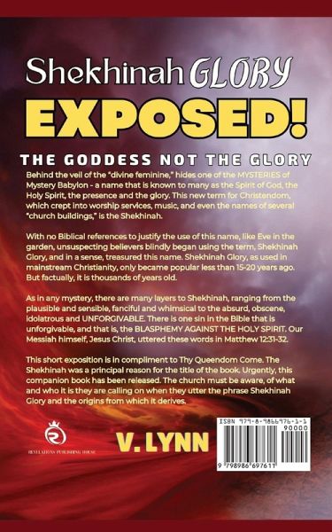 Behind the veil of the "divine feminine," hides one of the MYSTERIES of Mystery Babylon - a name that is known to many as the Spirit of God, the Holy Spirit, the presence and the glory. This new term for Christendom, which crept into worship services, music, and even the names of several "church buildings," is the Shekhinah. With no Biblical references to justify the use of this name, like Eve in the garden, unsuspecting believers blindly began using the term, Shekhinah Glory, and in a sense, treasured this name. Shekhinah Glory, as used in mainstream Christianity, only became popular less than 15-20 years ago. But factually, it is thousands of years old. As in any mystery, there are many layers to Shekhinah, ranging from the plausible and sensible, fanciful and whimsical to the absurd, obscene, idolatrous and UNFORGIVABLE. There is one sin in the Bible that is unforgivable, and that is, the BLASPHEMY AGAINST THE HOLY SPIRIT. Our Messiah himself, Jesus Christ, uttered these words in Matthew 12:31-32. This short exposition is in compliment to Thy Queendom Come. The Shekhinah was a principal reason for the title of the book. Urgently, this companion book has been released. The church must be aware, of what and who it is they are calling on when they utter the phrase Shekhinah Glory and the origins from which it derives.