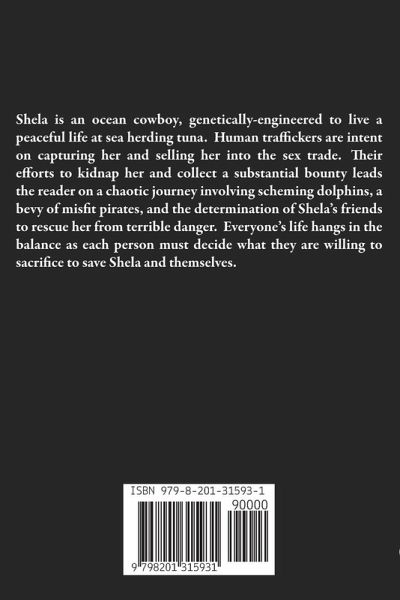Shela is an ocean cowboy, genetically-engineered to live a peaceful life at sea herding tuna. Human traffickers are intent on capturing her and selling her into the sex trade. Their efforts to kidnap her and collect a substantial bounty leads the reader on a chaotic journey involving scheming dolphins, a bevy of misfit pirates, and the determination of Shela's friends to rescue her from terrible danger. Everyone's life hangs in the balance as each person must decide what they are willing to sacrifice to save Shela and themselves.