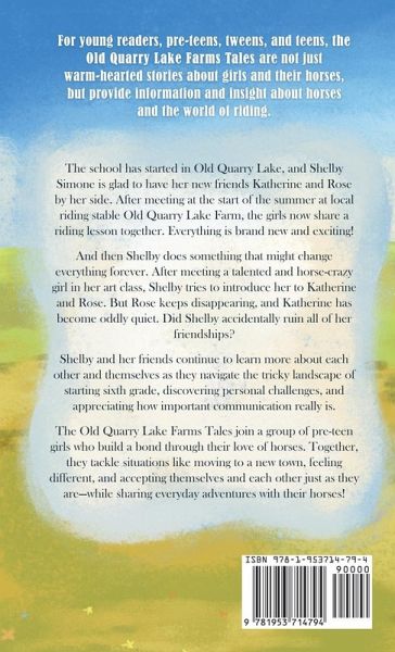 The school has started again in the quiet rural town of Old Quarry Lake. Newcomer Shelby and her "townie" friends Katherine and Rose have had an amazing summer becoming friends and spending time with horses. Shelby is afraid that going to school will change the dynamic in her friend group, and she's right. After meeting a fellow horse-crazy girl named Agate in art class, Shelby introduces her to Rose and Katherine. That's when things get... well, weird. Rose keeps disappearing, and Katherine doesn't seem to have much to say to Shelby anymore. As the school year drags on, Shelby finds herself feeling more distant from her friends than ever. Was introducing Agate to her friends a huge mistake? Join the riders of Old Quarry Lake Farms as they spend their first year in school together. A new school building, a new group of friends, and new challenges to face at school and the barn-will the girls be able to navigate so many changes at once? This book is perfect for:Girls ages 9-12 Teachers in elementary school through seventh grade Parents and grandparents with girls who love horses Anyone looking to teach children about empathy, friendship, and compassion Any child struggling with learning challenges (ADHD, Autism Spectrum) and mental health (Anxiety) Readers can relate to issues experienced by the characters in this book, including:Body image concerns Bullying Self-image and self-esteem Starting a new grade at a new school Learning challenges and neurodivergence For young readers, pre-teens, tweens, and teens, the Old Quarry Lake Farms Tales are not just warm-hearted stories about girls and their horses, but provide information and insight about horses and the world of riding. This is the third book in the The Old Quarry Lake Farms Tales Series.