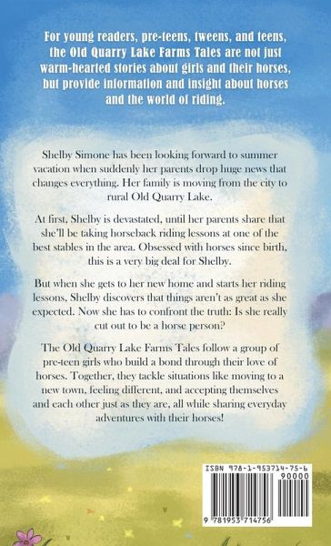 Shelby Simone is a horse-crazy kid living in the city with her parents. Despite having the best friends ever at the exclusive Metro School for Girls, she can't help but feel something is missing from her life. When her parents break the news to her that they're moving to a nearby rural community, Shelby is devastated... until her parents promise she can take riding lessons at Old Quarry Lake Farms, one of the best-known riding stables in the state! Shelby only has a month to say goodbye to city life and hello to a new world that includes horses. After a rough start at Old Quarry Lake, Shelby starts to wonder if horses are really as wonderful as she imagined. As the summer days creep closer and closer to her first day at the Old Quarry Lake school, she worries if the trade-off was worth it. Join a group of pre-teen girls who build a bond through their love of horses. Together, they tackle situations like moving to a new town, feeling different, and accepting themselves and each other just as they are-while sharing everyday adventures with their horses! For young readers, pre-teens, tweens, and teens, the Old Quarry Lake Farms Tales are not just warm-hearted stories about girls and their horses, but provide information and insight about horses and the world of riding. This is the first book in the The Old Quarry Lake Farms Tales Series.