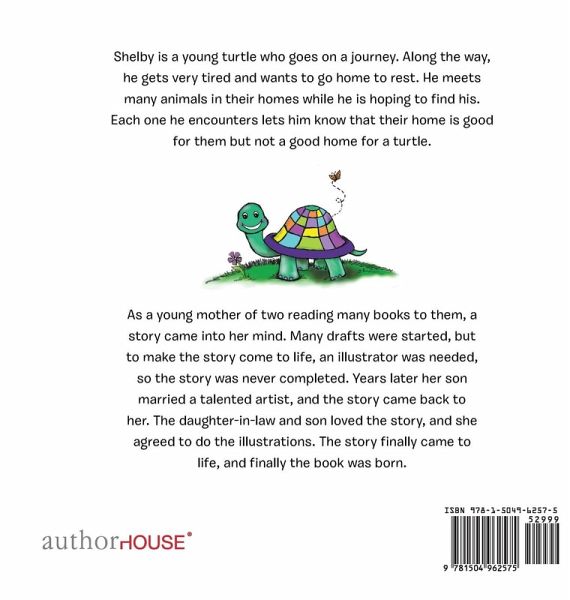 Shelby is a young turtle who goes on a journey. Along the way, he gets very tired and wants to go home to rest. He meets many animals in their homes while he is hoping to find his. Each one he encounters lets him know that their home is good for them but not a good home for a turtle.