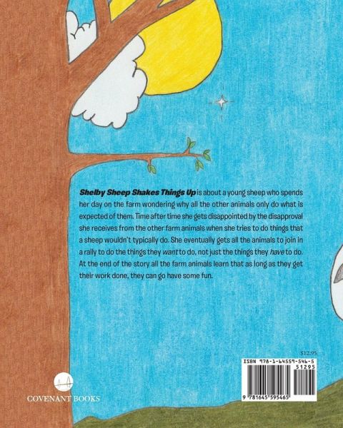 Shelby Sheep Shakes Things Up is about a young sheep who spends her day on the farm wondering why all the other animals only do what is expected of them. Time after time she gets disappointed by the disapproval she receives from the other farm animals when she tries to do things that a sheep wouldn't typically do. She eventually gets all the animals to join in a rally to do the things they want to do, not just the things they have to do. At the end of the story all the farm animals learn that as long as they get their work done, they can go have some fun.