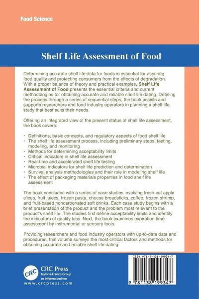 An Introduction to Food Shelf Life: Definitions, Basic Concepts, and Regulatory Aspects.The Shelf Life Assessment Process. The Acceptability Limit. Critical Indicators in Shelf Life Assessment. Modeling Shelf Life Using Chemical, Physical, and Sensory Indicators. Modeling Shelf Life Using Microbial Indicators. Modeling Shelf Life Using Survival Analysis Methodologies. Packaging-Food Interactions in Shelf Life Modeling. Case Studies. Index.