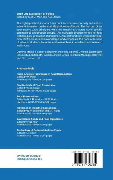 1 - The principles.- 1 Scientific principles of shelf life evaluation.- 1.1 Introduction.- 1.2 Major modes of food deterioration.- 1.2.1 Physical changes.- 1.2.2 Chemical changes.- 1.2.3 Microbiological changes.- 1.3 Evaluation of food quality.- 1.3.1 Reaction kinetics.- 1.3.2 Determination of kinetic parameters.- 1.3.3 Shelf life plots.- 1.4 Use of sensors to monitor shelf life of foods.- 1.4.1 Critical temperature indicators.- 1.4.2 Partial history indicators.- 1.4.3 Full history indicators.- 1.5 Conclusions.- References.- 2 The methodology of shelf life determination.- 2.1 Integration of shelf life procedures into a total quality system.- 2.2 Food legislation and shelf life.- 2.3 Forms of quality deterioration during storage.- 2.4 Procedures for direct determination and monitoring of shelf life.- 2.5 Methodology for accelerated estimation of shelf life.- 2.6 The importance of shelf life to quality and distribution.- 2.7 Conclusions.- References.- 3 The principles and practice of shelf life prediction for microorganisms.- 3.1 Introduction.- 3.2 Development of predictive models.- 3.2.1 Experimental design.- 3.2.2 Data collection.- 3.2.3 Modelling.- 3.2.4 Model validation.- 3.2.5 Obtaining predictions.- 3.3 Uses of models.- 3.3.1 Product formulation and reformulation.- 3.3.2 Process design.- 3.3.3 HACCP.- 3.3.4 Time-temperature profiles.- 3.3.5 Training and education.- 3.4 Limitations of models.- 3.5 The future.- References.- 4 Packaging and food quality.- 4.1 Introduction.- 4.2 Plastics packaging materials for food.- 4.2.1 Polyolefins.- 4.2.2 Polyvinyl chloride (PVC).- 4.2.3 Polyvinylidene chloride (PVdC).- 4.2.4 Ethylene vinyl alcohol (EVOH).- 4.2.5 Polystyrene (PS).- 4.2.6 Polyamides (nylons).- 4.2.7 Polyesters.- 4.2.8 Polycarbonates (PC).- 4.2.9 Lamination and coextrusion.- 4.3 Some packaging systems and recent developments.- 4.3.1 Trends in food packaging.- 4.3.2 Silica-coated films.- 4.3.3 Active packaging technologies.- 4.3.4 Modified atmosphere packaging (MAP).- 4.3.5 Aseptic/ultra-high temperature (UHT) packaging.- 4.3.6 Sous vide (vacuum cooking/packaging) technology.- 4.3.7 Edible films.- 4.4 The influence of 'scalping' on food.- 4.4.1 The limonene controversy.- 4.4.2 The influence of pulp content on scalping.- 4.4.3 Comparison of instrumental and sensory analysis.- 4.4.4 Influence of scalping on barrier and mechanical properties.- 4.4.5 Methods of suppressing scalping.- 4.5 Flavour transfer problems in refillable PET bottles.- 4.6 Conclusions.- References.- 5 Preservation technology and shelf life of fish and fish products.- 5.1 Introduction.- 5.2 Properties and spoilage of fish.- 5.3 Conventionally preserved fish and fish products.- 5.4 Modern technologies.- 5.5 Sensory quality and safety.- 5.6 Conclusions.- 2 - The practice.- 6 Delicatessen salads and chilled prepared fruit and vegetable products.- 6.1 Introduction.- 6.2 The products - their characteristics.- 6.3 Specific factors affecting shelf life.- 6.3.1 Delicatessen salads.- 6.3.2 Prepared fruit and vegetables.- 6.4 Determination of shelf life.- 6.4.1 Delicatessen salads.- 6.4.2 Prepared fruit and vegetables.- 6.5 Current developments and the future.- 6.5.1 Delicatessen salads.- 6.5.2 Prepared fruit and vegetables.- References.- 7 Chilled yogurt and other dairy desserts.- 7.1 Introduction.- 7.2 Products, product groups and characteristics.- 7.2.1 Product groups.- 7.2.2 Product characteristics.- 7.3 Factors affecting shelf life.- 7.3.1 Raw materials.- 7.3.2 Processing.- 7.3.3 Filling and packaging.- 7.3.4 Storage and distribution.- 7.3.5 Consumer storage.- 7.4 Evaluation methods.- 7.4.1 Shelf life determination - yogurt.- 7.5 Current developments and the future.- 8 Modified-atmosphere-packed ready-to-cook and ready-to-eat meat products.- 8.1 Introduction.- 8.2 Meat product groups and their basic characteristics.- 8.2.1 Appearance.- 8.2.2 Flavour.- 8.2.3 Texture.- 8.3 Factors affecting shelf life.- 8.3.1 Intrinsic factors.- 8.3.2 Extrinsic factors.- 8.4 Det...