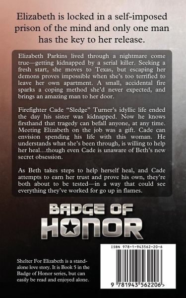 Elizabeth Parkins lived through a nightmare come true-getting kidnapped by a serial killer. Seeking a fresh start, she moves to Texas, but escaping her demons proves impossible when she's too terrified to leave her own apartment. A small, accidental fire sparks a coping method she'd never expected, and brings an amazing man to her door. Firefighter Cade "Sledge" Turner's idyllic life ended the day his sister was kidnapped. Now he knows firsthand that tragedy can befall anyone, at any time. Meeting Elizabeth on the job was a gift. Cade can envision spending his life with this woman. He understands what she's been through, is willing to help her heal...though even Cade is unaware of Beth's new secret obsession. As Beth takes steps to help herself heal, and Cade attempts to earn her trust and prove his own, they're both about to be tested-in a way that could see everything they've worked for go up in flames. * Shelter for Elizabeth is the 5th book in the Badge of Honor: Texas Heroes series. Each book is a stand-alone, with no cliffhanger endings.