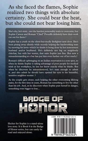 She's shy, he's stoic...not the hardest personality traits to overcome, but Sophie Carson and Roman "Chief" Proudfit have their work cut out for them. Sophie has a crush on the silent-but-studly firefighter next door. She's been pining away silently while secretly helping the hardworking man by mowing his lawn-which he thinks is being done by her nonexistent husband and/or boyfriend. He's definitely not big on neighborly chitchat, but with her stutter, that suits Sophie just fine. But now a misunderstanding at a bar has put him even further out of her reach. Roman's difficult upbringing on an Indian reservation is a sore spot, so when he thinks Sophie is taking advantage of poor people for medical trials at her workplace, he lets her know exactly what he thinks. But when he discovers he misunderstood, he's man enough to admit it...and also that he should have opened his eyes to his beautiful, sensitive neighbor sooner. As the couple gets closer, each helping the other overcome lifelong pains, for the first time in years, Roman has something to live for other than his job. And, as he discovers when Sophie puts herself in danger, something even bigger to lose... ** Shelter for Sophie is the 8th book in the Badge of Honor: Texas Heroes Series. Each book is a stand-alone, with no cliffhanger endings.
