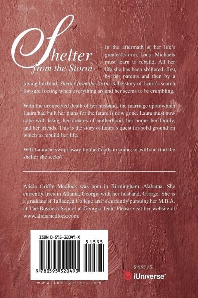 In the aftermath of her life's greatest storm, Laura Michaels must learn to rebuild. All her life she has been sheltered, first by her parents and then by a loving husband. Shelter from the Storm is the story of Laura's search for sure footing when everything around her seems to be crumbling. With the unexpected death of her husband, the marriage upon which Laura had built her plans for the future is now gone. Laura must now cope with losing her dreams of motherhood, her home, her family, and her friends. This is the story of Laura's quest for solid ground on which to rebuild her life. Will Laura be swept away by the floods to come, or will she find the shelter she seeks?