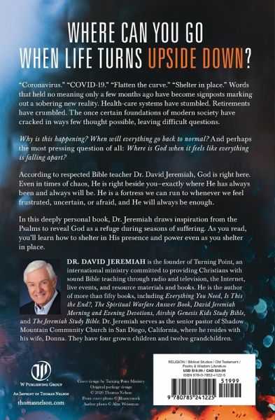In a period of almost unbearable uncertainty and fear, many of us have wondered, "Does God see us? Can he help us through this nerve-racking time?" Beloved Bible teacher Dr. David Jeremiah shares through psalms that God is always walking beside us. Now is the time to Shelter in God. Renowned pastor and teacher Dr. David Jeremiah believes comfort can be found in the Psalms, not only during the COVID-19 pandemic and during all of life's greatest challenges. This newly collected volume will show how finding refuge in God is always our safest place. Shelter in God offers hope in a time of uncertainty and relief to people who are experiencing real troubles and fear. In Shelter in God you will: * Find ways to worship in times of trouble * Discover words of encouragement and hope * Show grace when you are at your wits' end * Triumph over trouble with God's help Shelter in God is an invaluable source of help and encouragement for people facing stress, anxiety and depression, and major obstacles during the COVID-19 pandemic and beyond. Portions of Shelter in God were previously included in Dr. Jeremiah's classic When Your World Falls Apart.