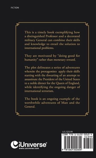 This is a timely book exemplifying how a distinguished Professor and a decorated military General can combine their skills and knowledge to entail the solution to international problems. They are motivated by "doing good for humanity" rather than monetary reward. The plot delineates a series of adventures wherein the protagonists apply their skills starting with the thwarting of an attempt to assassinate the President of the United States to a noble dinner for the Queen of England, while identifying the ongoing danger of international terrorism. The book is an ongoing example of the worthwhile adventures of Matt and the General.