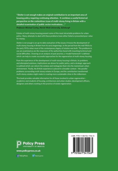 Estates of multi-storey housing present some of the most intractable problems for urban policy. Shelter is not enough is an up-to-date evaluation of the issues. Drawing on an analysis of past practice, a 'model framework' is defined which can help to create successful approaches for the regeneration of multi-storey housing.