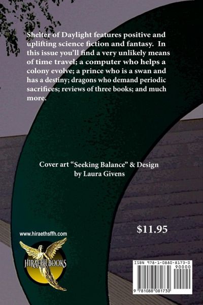 Shelter of Daylight features positive and uplifting science fiction and fantasy. In this issue you'll find a very unlikely means of time travel; a computer who helps a colony evolve; a prince who is a swan and has a destiny; dragons who demand periodic sacrifices; reviews of three books; and much more.