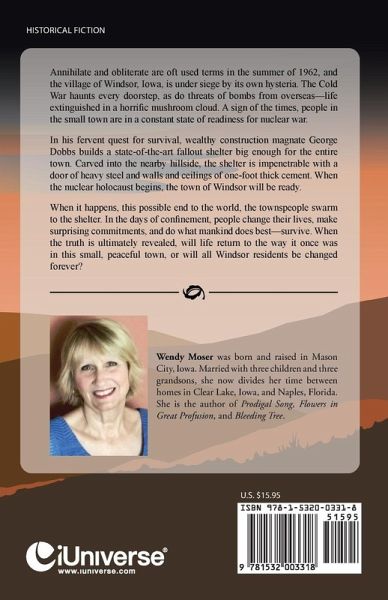 Annihilate and obliterate are oft used terms in the summer of 1962, and the village of Windsor, Iowa, is under siege by its own hysteria. The Cold War haunts every doorstep, as do threats of bombs from overseas-life extinguished in a horrific mushroom cloud. A sign of the times, people in the small town are in a constant state of readiness for nuclear war. In his fervent quest for survival, wealthy construction magnate George Dobbs builds a state-of-the-art fallout shelter big enough for the entire town. Carved into the nearby hillside, the shelter is impenetrable with a door of heavy steel and walls and ceilings of one-foot thick cement. When the nuclear holocaust begins, the town of Windsor will be ready. When it happens, this possible end to the world, the townspeople swarm to the shelter. In the days of confinement, people change their lives, make surprising commitments, and do what mankind does best-survive. When the truth is ultimately revealed, will life return to the way it once was in this small, peaceful town, or will all Windsor residents be changed forever?