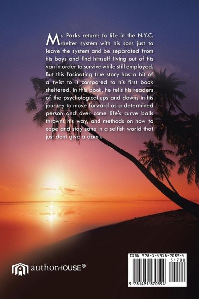 Mr. Parks returns to life in the N.Y.C. shelter system with his sons just to leave the system and be separated from his boys and find himself living out of his van in order to survive while still employed. But this facinating true story has a bit of a twist to it compared to his first book sheltered. In this book, he tells his readers of the psychological ups and downs in his journey to move forward as a determined person and over come life's curve balls throwns his way, and methods on how to cope and stay sane in a selfi sh world that just dont give a damn.