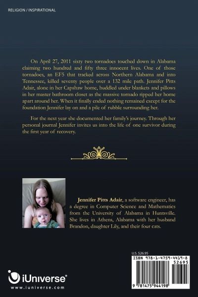 On April 27, 2011 sixty two tornadoes touched down in Alabama claiming two hundred and fifty three innocent lives. One of those tornadoes, an EF5 that tracked across Northern Alabama and into Tennessee, killed seventy people over a 132 mile path. Jennifer Pitts Adair, alone in her Capshaw home, huddled under blankets and pillows in her master bathroom closet as the massive tornado ripped her home apart around her. When it finally ended nothing remained except for the foundation Jennifer lay on and a pile of rubble surrounding her. For the next year she documented her family's journey. Through her personal journal Jennifer invites us into the life of one survivor during the first year of recovery.