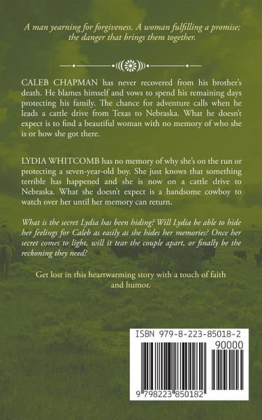 A man yearning for forgiveness. A woman fulfilling a promise; the danger that brings them together. Caleb Chapman has never recovered from his brother's death. He blames himself and vows to spend his remaining days protecting his family. The chance for adventure calls when he leads a cattle drive from Texas to Nebraska. What he doesn't expect is to find a beautiful woman with no memory of who she is or how she got there. Lydia Whitcomb has no memory of why she's on the run or protecting a seven-year-old boy. She just knows that something terrible has happened and she is now on a cattle drive to Nebraska. What she doesn't expect is a handsome cowboy to watch over her until her memory can return. What is the secret Lydia has been hiding? Will Lydia be able to hide her feelings for Caleb as easily as she hides her memories? Once her secret comes to light, will it tear the couple apart, or finally be the reckoning they need? This book was originally titled CALEB and released as part of the series called The Chapmans. It has been retitled and incorporated into the First Families of Flat River so the series may be expanded and include many new stories for you to enjoy, not just limiting it to one family. Nothing else has changed from when it was originally published. ¿¿ Get lost in this heartwarming story with a touch of humor and faith. ¿¿ Come spend time in Flat River, Nebraska. A small town filled with the strong men and women that settled the wild west of the Nebraska Plains from 1860 to 1880. Flat River is home to unique characters, strong heroines, swoony heroes, and stories that will stand the test of time. All these wholesome stories can be read by readers of all ages. They are filled with family values, romance, humor, and a sprinkle of faith.