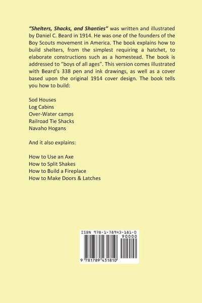 ""Shelters, Shacks, and Shanties"" was written and illustrated by Daniel C. Beard in 1914. He was one of the founders of the Boy Scouts movement in America. The book explains how to build shelters, from the simplest requiring a hatchet, to elaborate constructions such as a homestead. The book is addressed to ""boys of all ages"". This version comes illustrated with Beard's 338 pen and ink drawings, as well as a cover based upon the original 1914 cover design. The book tells you how to build: Sod Ho