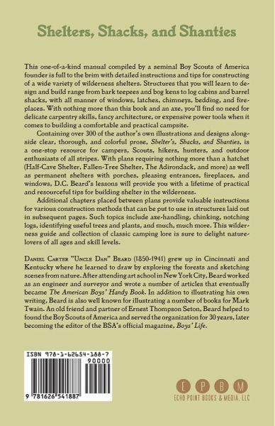 This one-of-a-kind manual compiled by a seminal Boy Scouts of America founder is full to the brim with detailed instructions and tips for constructing of a wide variety of wilderness shelters. Structures you'll learn to design and erect range from bark teepees and bog kens to log cabins and barrel shacks, with all manner of windows, latches, chimneys, bedding, and fireplaces. With nothing more than this book and an axe, you'll find there's no need for delicate carpentry skills, fancy architecture, or expensive power tools when it comes to building a comfortable and practical campsite. Containing over 300 of the author's own illustrations and designs alongside clear, thorough, and colorful prose, Shelter's, Shacks, and Shanties, is a one-stop resource for campers, Scouts, hikers, hunters, and outdoor enthusiasts of all stripes. With plans requiring nothing more than a hatchet (Half-Cave Shelter, Fallen-Tree Shelter, The Adirondack, and more) as well as permanent shelters with porches, pleasing entrances, fireplaces, and windows, D.C. Beard's lessons will provide you with a lifetime of practical and resourceful tips for building shelter in the wilderness. Additional chapters placed between plans provide valuable instructions for various construction methods that can be put to use in structures laid out in subsequent pages. Such topics include axe-handling, chinking, notching logs, identifying useful trees and plants, and much, much more. This wilderness guide and collection of classic camping lore is sure to delight nature-lovers of all ages and skill levels. About the Author Daniel Carter "Uncle Dan" Beard (1850-1941) grew up in Cincinnati and Kentucky where he learned to draw by exploring the forests and sketching scenes from nature. After attending art school in New York City, Beard worked as an engineer and surveyor and wrote a number of articles that eventually became The American Boy's Handy Book. In addition to illustrating his own writing, Beard is also well known for illustrating a number of books for Mark Twain. An old friend and partner of Ernest Thompson Seton, Beard helped to found the Boy Scouts of America and served the organization for 30 years, later becoming the editor of the BSA's official magazine, Boys' Life.