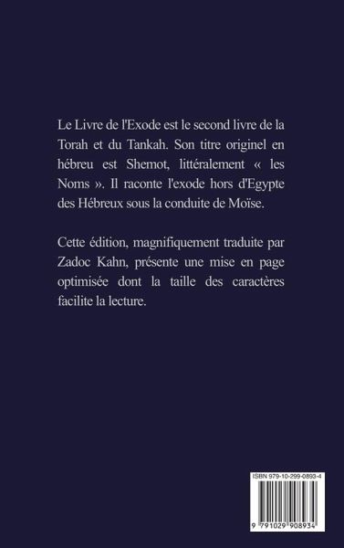 Le Livre de l'Exode est le second livre de la Torah et du Tankah. Son titre originel en hébreu est Shemot, littéralement « les Noms ». Il raconte l'exode hors d'Egypte des Hébreux sous la conduite de Moïse. Cette édition, magnifiquement traduite par Zadoc Kahn, présente une mise en page optimisée dont la taille des caractères facilite la lecture.