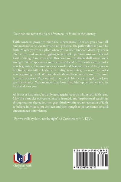 Destination's never the place of victory, it's found in the journey! Faith contains power to birth the supernatural. It raises you above all circumstance to believe in what is not yet seen. The path walked is paved by faith. Maybe you're at a place where you've been knocked down by storm after storm, and you're struggling to get back up. Situations you believed God to change have worsened. This hour your weakness shall know God's strength. What appears as your defeat and end births forth victory and a new beginning. Circumstances appeared as defeat and the end for Jesus as he climbed the hill to Calvary. In reality, it was his greatest victory and a new beginning for all. Without death, there'd be no resurrection. The same is true in our walk. Peter walked on water till his focus changed from Jesus to circumstance. Yet remember that Jesus lifted him up before he sank. As he shall do for you. All is not as it appears. You only need regain focus on whom your faith rests. May the obstacles overcome, lessons learned, and inspirational teachings throughout my shared journey grant birth within you to revelation of faith to believe in what is not yet seen and the strength to perseverance beyond circumstance unto victory. "For we walk by faith, not by sight" (2 Corinthians 5:7, KJV).