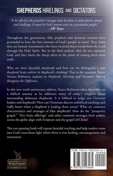 Throughout the generations, false prophets and insincere teachers have pretended to have the best interests of God's people in mind. They claim they are human instruments who have received direct words of the Lord through the Holy Spirit. But in the final analysis, they do not represent God, and they harm the sheep often to the point of costing them their souls. Who are these deceitful shepherds and how can we distinguish a true shepherd from wolves in shepherd's clothing? That is the question Pastor Tavares Robinson explores in Shepherds, Hirelings and Dictators: How to Recognize the Difference. In this new tenth-anniversary edition, Pastor Robinson takes the reader on a Biblical journey as he addresses many of today's toughest issues surrounding dishonest shepherds: Is it biblical to judge our Christian leaders and shepherds? How can Christians discern unbiblical teachings and really know when a shepherd is leading them astray? What are common characteristics and messages of false shepherds? How do the "prosperity gospel," "first fruits offerings" and other common messages from pulpits across the globe align with scripture and the gospel of Christ? All these issues and many more are hit head-on by Pastor Robinson in his challenging, but yet encouraging book.