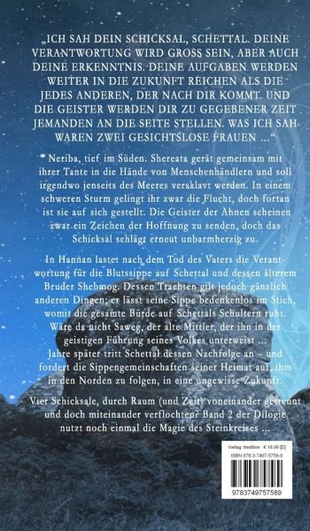 "ICH SAH DEIN SCHICKSAL, SCHETTAL. DEINE VERANTWORTUNG WIRD GROSS SEIN, ABER AUCH DEINE ERKENNTNIS. DEINE AUFGABEN WERDEN WEITER IN DIE ZUKUNFT REICHEN ALS DIE JEDES ANDEREN, DER NACH DIR KOMMT. UND DIE GEISTER WERDEN DIR ZU GEGEBENER ZEIT JEMANDEN AN DIE SEITE STELLEN. WAS ICH SAH WAREN ZWEI GESICHTSLOSE FRAUEN ..."Neriba, tief im Süden. Shereata gerät gemeinsam mit ihrer Tante in die Hände von Menschenhändlern und soll irgendwo jenseits des Meeres versklavt werden. In einem schweren Sturm gelingt ihr zwar die Flucht, doch fortan ist sie auf sich gestellt. Die Geister der Ahnen scheinen zwar ein Zeichen der Hoffnung zu senden, doch das Schicksal schlägt erneut unbarmherzig zu.In Hannan lastet nach dem Tod des Vaters die Verantwortung für die Blutssippe auf Schettal und dessen älterem Bruder Shebmog. Dessen Trachten gilt jedoch gänzlich anderen Dingen; er lässt seine Sippe bedenkenlos im Stich, womit die gesamte Bürde auf Schettals Schultern ruht. Wäre da nicht Saweg, der alte Mittler, der ihn in der geistigen Führung seines Volkes unterweist ...Jahre später tritt Schettal dessen Nachfolge an - und fordert die Sippengemeinschaften seiner Heimat auf, ihm in den Norden zu folgen, in eine ungewisse Zukunft.Vier Schicksale, durch Raum (und Zeit) voneinander getrennt und doch miteinander verflochten? Band 2 der Dilogie nutzt noch einmal die Magie des Steinkreises ...