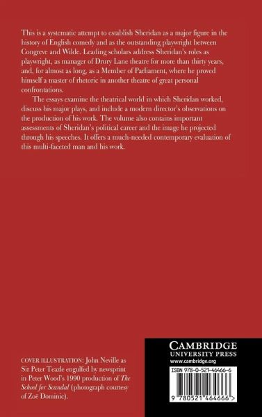 Notes on contributors; List of illustrations; Some dates in Sheridan's life; Introduction; 1. Theatre in the age of Garrick and Sheridan Mark S. Auburn; 2. 'Future retrospection': rereading Sheridan's reviewers Richard C. Taylor; 3. Sheridan, Congreve and The School for Scandal Eric Rump; 4. Sheridan, Molière and the idea of the school in The School for Scandal James Morwood; 5. Satire and celebration in The Critic David Crane; 6. Sheridan and language Jack D. Durant; 7. Foiling the rival: argument and identity in Sheridan's speeches Christopher Reid; 8. The political career of Richard Brinsley Sheridan Christopher Clayton; 9. The ruin of a public man: the rise and fall of Richard Brinsley Sheridan as political reformer Marc Baer; 10. On producing Sheridan Peter Wood; Select bibliography; Index.