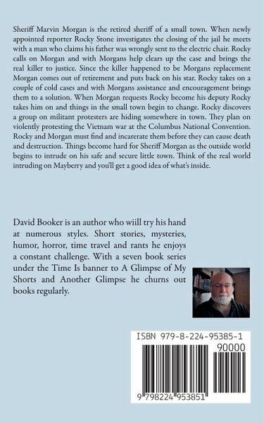 Sheriff Marvin Morgan is the retired sheriff of a small town. When newly appointed reporter Rocky Stone investigates the closing of the jail he meets with a man who claims his father was wrongly sent to the electric chair. Rocky calls on Morgan and with Morgans help clears up the case and brings the real killer to justice. Since the killer happened to be Morgans replacement Morgan comes out of retirement and puts back on his star. Rocky takes on a couple of cold cases and with Morgans assistance and encouragement brings them to a solution. When Morgan requests Rocky become his deputy Rocky takes him on and things in the small town begin to change. Rocky discovers a group on militant protesters are hiding somewhere in town. They plan on violently protesting the Vietnam war at the Columbus National Convention. Rocky and Morgan must find and incarerate them before they can cause death and destruction. Things become hard for Sheriff Morgan as the outside world begins to intrude on his safe and secure little town. Think of the real world intruding on Mayberry and you'll get a good idea of what's inside.