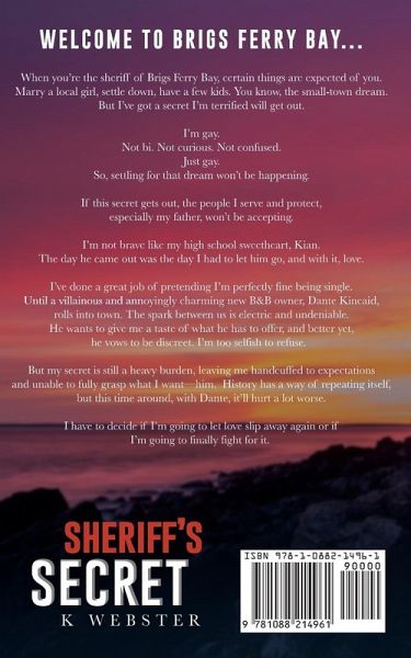 From USA Today bestselling author K Webster comes a steamy and emotional MM romance! When you're the sheriff of Brigs Ferry Bay, certain things are expected of you. Marry a local girl, settle down, have a few kids. You know, the small-town dream. But I've got a secret I'm terrified will get out. I'm gay. Not bi. Not curious. Not confused. Just gay. So, settling for that dream won't be happening. If this secret gets out, the people I serve and protect, especially my father, won't be accepting. I'm not brave like my high school sweetheart, Kian. The day he came out was the day I had to let him go, and with it, love. I've done a great job of pretending I'm perfectly fine being single. Until a villainous and annoyingly charming new B&B owner, Dante Kincaid, rolls into town. The spark between us is electric and undeniable. He wants to give me a taste of what he has to offer, and better yet, he vows to be discreet. I'm too selfish to refuse. But my secret is still a heavy burden, leaving me handcuffed to expectations and unable to fully grasp what I want-him. History has a way of repeating itself, but this time around, with Dante, it'll hurt a lot worse. I have to decide if I'm going to let love slip away again or if I'm going to finally fight for it. ***Brigs Ferry Bay is a steamy MM romance series. While each book can be read as a standalone, in order to get the full experience, they're best read in order. Enemies to lovers, friends to lovers, hurt comfort, age-gap romance, and so much more. Fall in love with the charming small-town gay romances of Brigs Ferry Bay...***