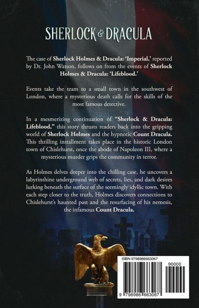 The case of Sherlock Holmes & Dracula: 'Imperial,' reported by Dr. John Watson, follows on from the events of Sherlock Holmes & Dracula: 'Lifeblood.' A mystery detective book. Events take the team to a small town in the southwest of London, where a mysterious death calls for the skills of the most famous detective. In a mesmerizing continuation of "Sherlock & Dracula: Lifeblood," this story thrusts readers back into the gripping world of Sherlock Holmes and the hypnotic Count Dracula. This thrilling installment takes place in the historic London town of Chislehurst, once the abode of Napoleon III, where a mysterious murder grips the community in terror. Chislehurst's tranquility is shattered when a young boy's mangled remains are discovered, frightening its inhabitants. Desperate for answers, Detective Hopkins turns to the legendary detective Sherlock Holmes, whose unmatched intellect and unparalleled deductive skills have earned him an enduring reputation. As Holmes delves deeper into the chilling case, he uncovers a labyrinthine underground web of secrets, lies, and dark desires lurking beneath the surface of the seemingly idyllic town. With each step closer to the truth, Holmes discovers connections to Chislehurst's haunted past and the resurfacing of his nemesis, the infamous Count Dracula. The enigmatic Count, ever immersed in the shadows, possesses secrets that intertwine with the gruesome murder. The conflict between Holmes and Dracula reignites as the investigation unfurls, fueled by their contrasting methodologies and clashing worldviews. Holmes, guided by his unwavering dedication to reason and logic, matches wits with the immortal vampire, who brings an otherworldly presence and a thirst for power to the sinister game. As the fog of mystery thickens, the pursuit of truth becomes increasingly treacherous. Holmes and Dracula navigate a web of enigmatic suspects, each harboring sinister motives. The stakes escalate, drawing the two iconic figures into a battle of wits and wills that will shape the destiny of Chislehurst and their own intertwined fates. In "Sherlock & Dracula: Imperial," Kev Freeman masterfully continues the thrilling saga, seamlessly blending the worlds of Arthur Conan Doyle and Bram Stoker. With meticulous attention to historical detail, Kev Freeman brings the fog-laden streets of Victorian London and the sinister depths of the supernatural to life, weaving a tale that tantalizes and terrifies in equal measure. Prepare to be enthralled as Holmes and Dracula, each possessing unique brilliance, collide in a clash that transcends time and reality. "Sherlock & Dracula: Imperial" is a gripping fusion of mystery, horror, and historical intrigue, cementing its place as a must-read for fans of both iconic characters and lovers of suspenseful storytelling A mystery detective book.