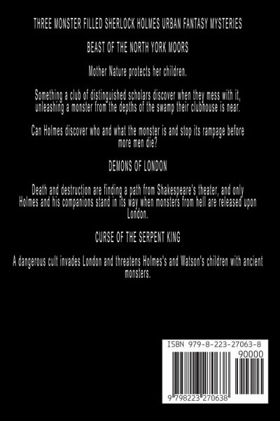 BEAST OF THE NORTH YORK MOORS Mother Nature protects her children. Something a club of distinguished scholars discover when they mess with it, unleashing a monster from the depths of the swamp their clubhouse is near. Can Holmes discover who and what the monster is and stop its rampage before more men die? DEMONS OF LONDON Death and destruction are finding a path from Shakespeare's theater, and only Holmes and his companions stand in its way when monsters from hell are released upon London. CURSE OF THE SERPENT KING A dangerous cult invades London and threatens Holmes's and Watson's children with ancient monsters. Dig right into these three books for mystery, suspense, action and adventure as Holmes works the cases in these Urban Fantasy settings.