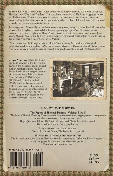 In 1893, Dr. Watson and Conan Doyle published what they believed was the last Sherlock Holmes story, 'The Final Problem'. The world was stunned, and The Strand Magazine rushed to fill the vacuum. Readers were soon introduced to a new detective, Martin Hewitt, as presented by Arthur Morrison. Although initially different than Holmes, Hewitt also showed a number of interesting similarities as well . . . . For many years, Martin Hewitt has been mostly forgotten, except in some Sherlockian circles, where it has long been theorized that he was a young Mycroft Holmes. However, recent evidence has come to light that Hewitt's adventures were in fact cases undertaken by a young Sherlock Holmes when he lived in Montague Street, several years before he would take up his legendary rooms in Baker Street with Watson. These volumes are the Complete Martin Hewitt Stories, taking Arthur Morrison's original publications and presenting them as Sherlock Holmes adventures. If you are a fan of Holmes, enjoy! And by all means, seek out the original Hewitt stories and enjoy them as well. The Game is afoot!