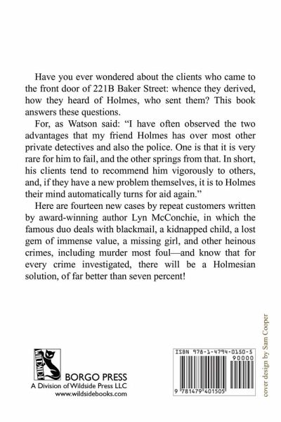 Have you ever wondered about the clients who came to the front door of 221B Baker Street: whence they derived, how they heard of Holmes, who sent them? This book answers these questions. For, as Watson said: "I have often observed the two advantages that my friend Holmes has over most other private detectives and also the police. One is that it is very rare for him to fail, and the other springs from that. In short, his clients tend to recommend him vigorously to others, and, if they have a new problem themselves, it is to Holmes their mind automatically turns for aid again." Here are fourteen new cases by repeat customers written by award-winning author Lyn McConchie, in which the famous duo deals with blackmail, a kidnapped child, a lost gem of immense value, a missing girl, and other heinous crimes, including murder most foul--and know that for every crime investigated, there will be a Holmesian solution, of far better than seven percent!