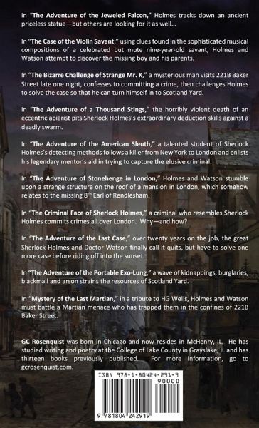 Sherlock Holmes is at it again... In "The Adventure of the Jeweled Falcon", Holmes tracks down an ancient priceless statue, but others are looking for it, too. In, "The case of the Violin Savant", using clues found in the sophisticated musical compositions of a celebrated but mute nine year-old violin savant, Holmes and Watson attempt to discover where and why the boy and his parents vanished. In, "The Bizarre Challenge of Strange Mr. K", a mysterious man visits 221B Baker Street late one night, confesses to committing a crime then challenges Holmes to solve the case so that he can turn himself in to Scotland Yard, but all Holmes has to go on is the strange man himself and a little luck. In, "The Adventure of a Thousand Stings", the horribly violent death of an eccentric apiarist pits Sherlock Holmes' extraordinary deduction skills against an insect that has practiced and refined its deadly, swarming version of warfare over millions of years. In, "The Adventure of the American Sleuth", a young New York City detective, a talented student of Sherlock Holmes' detecting methods, follows a killer to London and enlists his legendary mentor's aid in trying to capture the elusive criminal. In, "The Adventure of Stonehenge in London", Holmes and Watson stumble upon a strange structure on the roof of a mansion in London, and somehow it relates to the missing 8th Earl of Rendlesham. In, "The Criminal Face of Sherlock Holmes", a criminal that resembles Sherlock Holmes commits crimes all over London. Can the real Holmes solve the riddle as to why and how and restore law and order to the great city? In, "The Adventure of the Last Case", over twenty years on the job, the great Sherlock Holmes and Doctor Watson finally call it quits but have to solve one more case before riding off into the sunset. In, "The Adventure of the Portable Exo-Lung", a wave of kidnappings, burglaries, blackmail and arson strains the resources of Scotland Yard. As the great Sherlock Holmes follows the clues left behind, he discovers these crimes are part of a deeper, more devious plan to trap and eliminate him - permanently. In, "Mystery of the Last Martian", in a tribute to HG Wells, as the Martian invasion of England collapses, Holmes and Watson are forced into one final battle, a battle of pure intellect, against the superior intelligence of a solitary Martian who has trapped them in the confines of 221b Baker Street. GC Rosenquist was born in Chicago and now resides in McHenry, IL. He has studied writing and poetry at the College of Lake County in Grayslake, IL and has thirteen books previously published. For more information, go to gcrosenquist.com.