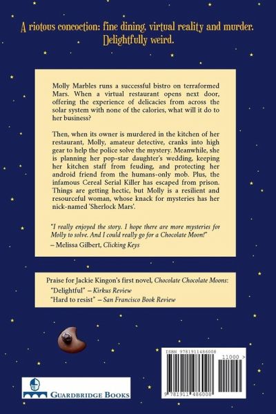 A riotous concoction: fine dining, virtual reality, and murder. Molly Marbles runs a successful bistro on terraformed Mars. But a virtual restaurant opens near her place, offering the experience of delicacies from across the Solar System with none of the calories. What will this do to her business? Then its owner is murdered in her kitchen. Molly, an amateur detective, springs into action to help the police solve the mystery, while also planning her pop-star daughter's wedding, keeping her kitchen staff from feuding, and protecting her cyborg friend from the humans-only mob. Meanwhile, the infamous Cereal Serial Killer has escaped prison on Pluto and has everyone worried. Things are getting hectic, but Molly is a resilient and resourceful woman. And her knack for mysteries sees her nick-named 'Sherlock Mars'. A rollicking science fiction, mystery, comedy.