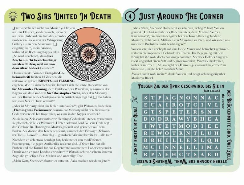 Moriarty ist auf freiem Fuß und London in Gefahr! Just in dem Augenblick, in dem Sherlock Holmes und Dr. John Watson von einer Weltreise in die Baker Street 221b zurückkehren, fordert Prof. James Moriarty seinen Kontrahenten heraus. Mit seiner Karte des Todes verfolgt er einen finstern Plan: Die Existens Londons steht auf dem Spiel!Begleite Holmes und Watson auf ihrer rasanten Jagd durch die britische Metropole! Dazu musst du 64 knifflige Denksport-Rätsel lösen, die es so richtig in sich haben. Stelle deine Fähigkeiten in Bereichen wie laterales Denken, logische Deduktion, Geheimcodes, Intuition und Beobachtungsgabe unter Beweis. Spannung und stundenlanger Rätselspaß garantiert!+ Inhalt: 33 große Rätsel-Klappkarten, 1 XXL-Stadtplan+ 64 Denksport-Rätsel rund um laterales Denken, logische Deduktion und Intuition+ gemeinsam mit Sherlock den finsteren Plan von Moriarty durchkreuzen