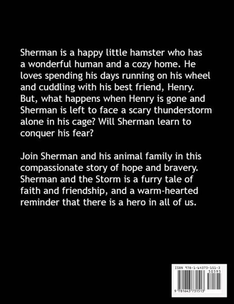 Sherman is a happy little hamster who has a wonderful human and a cozy home. He loves spending his days running on his wheel and cuddling with his best friend, Henry. But, what happens when Henry is gone and Sherman is left to face a scary thunderstorm alone in his cage? Will Sherman learn to conquer his fear? Join Sherman and his animal family in this compassionate story of hope and bravery. Sherman and the Storm is a furry tale of faith and friendship, and a warm-hearted reminder that there is a hero in all of us.