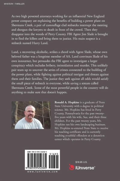As two high powered attorneys working for an influential New England power company are explaining the benefits of building a power plant on Shermans Creek, a pair of camouflage clad rednecks interrupt the meeting and shotgun the lawyers to death in front of the crowd. Then they disappear into the woods of Perry County. FBI Agent Jim Slade is brought in to find the killers and bring them to justice. His main suspect is a redneck named Harry Land. Land, a recovering alcoholic, strikes a chord with Agent Slade, whose own beloved father was a longtime member of AA. Land convinces Slade of his own innocence, but persuades the FBI agent to investigate a larger conspiracy which includes bribery, intimidation and murder. This unlikely pair team up to uncover the series of crimes connected to the building of the power plant, while fighting against political intrigue and threats against them and their families. The justice they seek against all odds would satisfy the small piece of redneck in everyone, while saving a stream called Shermans Creek. Some of the most powerful people in the country will do anything to make sure that doesn't happen.