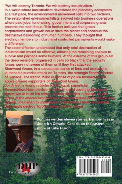 In a world where industrialism devastated the planetary ecosystem at a fast pace, the environmental movement split into two factions. The established environmentalists evolved into business operations where paid jobs, fundraising, government and corporate grants became the main focus. This faction believed that green corporations and growth could save the planet and continue the destructive ballooning of human numbers. They thought that electing members to industrialist-controlled parliaments would make a difference. The second faction understood that only total destruction of industrialism would be effective, allowing the remaining species to survive and perhaps some humans. At the extreme of this group sat the deep resistors, organized in cells so black that the security forces were not aware of them until they first attacked. Sherwood Green, in a spectacular series of fires and explosions, launched a surprise attack on Toronto, the strategic financial centre of Canada. The frantic, blind response of police focused on the above ground supporters of Sherwood Green. Jos Amiel, a young reporter for the local, superficial TorontoNewsNow television network, hoped covering Sherwood Green would build his career. Events drew him in deeper as the stress of the attacks exposed the seamy underside of the fragile city culture. Jos began to understand that if Sherwood Green succeeded, they would destroy Toronto along with his career.