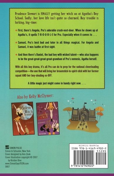 Prudence Stewart is FINALLY getting her witch on at Agatha's Day School. Sadly, her love life isn't quite so charmed. Boy trouble is lurking, big-time: - First, there's Angelo, Pru's adorable crush-next-door. When he shows up at Agatha's, it spells T-R-O-U-B-L-E for Pru. Especially when it comes to... - Samuel, Pru's best bud and tutor in all things magical. For Angelo and Samuel, it was loathe at first sight. - And then there's Daniel, the bad boy with wicked talent -- who also happensto be the great-great-great-great-grandson of Pru's nemesis, Agatha herself. With all this boy drama, it's all Pru can do to prep for the national cheerleading competition -- the one that will bring her broomstick-to- spirit-stick with her former squad AND her boy-stealing ex-BFF. A little magic just might come in handy right now....