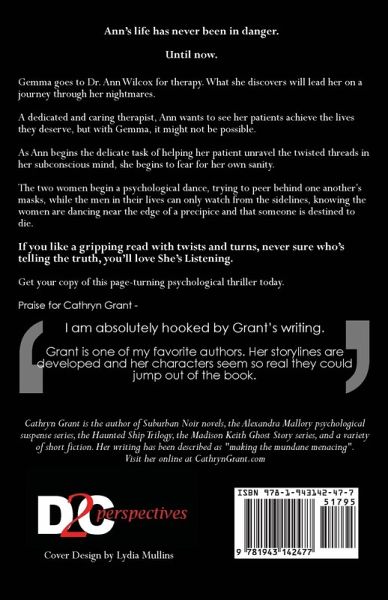 Revealing your secrets... can be deadly. Gemma goes to Dr. Ann Wilcox for therapy. What she uncovers will lead her on a journey through her long-forgotten nightmares. A dedicated and caring therapist, Ann wants to see her patients achieve the lives they deserve, but with Gemma, it might not be possible. As Ann begins the delicate task of helping her patient unravel the twisted threads in her subconscious mind, she begins to fear for her own sanity, and her life. The two women begin a psychological dance, trying to peer behind one another's masks, while the men in their lives can only watch from the sidelines, knowing the women are dancing near the edge of a precipice and that someone is destined to die. If you like a gripping domestic suspense thriller with twists and turns, never sure who's telling the truth, you'll love She's Listening. Get your copy of this page-turning psychological thriller today.